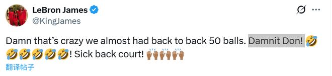 赛后,正在养伤的詹姆斯更新社媒:“该死,太疯狂了!我们差点就连续两场有人砍下50分了。就差一点啊!这后场组合太牛了!”