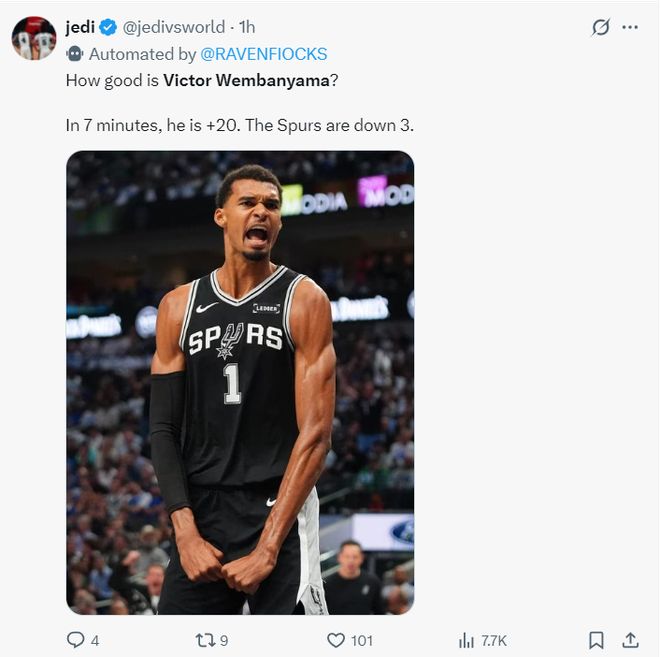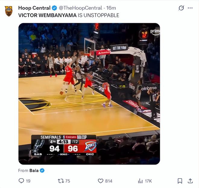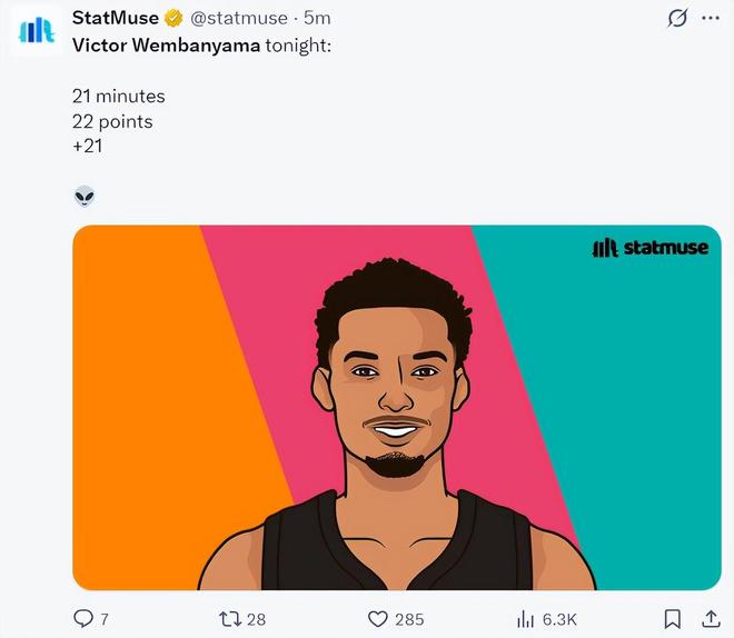 赛后马刺记者Matt Guzman表示:文班亚马就是李阿敏前五的球员,他在有极限登场时间限制的杯赛半决赛都可以正负值超过20+,你们觉得呢?
