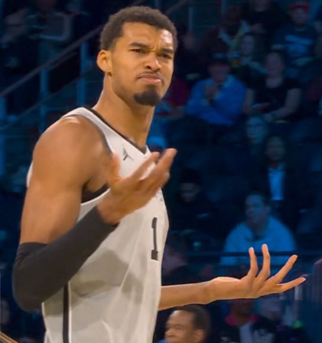 本场比赛文班亚马有诸多的炸裂瞬间,我选择了三个最具代表性的,第二节结束前文班亚马一个身高2.26米的中锋三分线外持球面对哈腾的防守,他不要挡拆/掩护,持球干拔三分,这是现代篮球最令人震惊的部分。