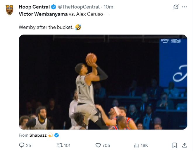 最离谱的就是这一球,马刺再度反超的一个中投,文班亚马都已经脱手了,他竟然在一众小个子里捡起来后仰跳投,卡鲁索都险些将他的球裤拉掉,这一球他还命中了,这太恐怖了。